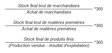 On mesurera avec les ratios suivants la vitesse de rotation des flux au sein de l'entreprise, la mesure qui en découle est donnée en jours. Cela nous permettra de vérifier la gestion des stocks que mène l'entreprise, fonctionne-elle à flux tendu ? Constitue-t-elle des réserves d'une année sur l'autre ? etc.