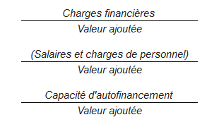 La valeur ajoutée dégagée par une entreprise est ensuite répartie entre plusieurs agents, avec les ratios suivants on déterminera sur lesquels elle se porte : Salariés, entreprise, coût du capital (charges financières), etc.