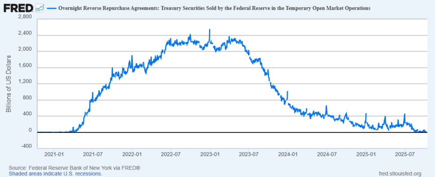 Quand l’utilisation du RRP diminue, cela signifie que les liquidités quittent les coffres de la Fed pour aller ailleurs, souvent vers les bons du Trésor, les marchés repo ou le système bancaire.
