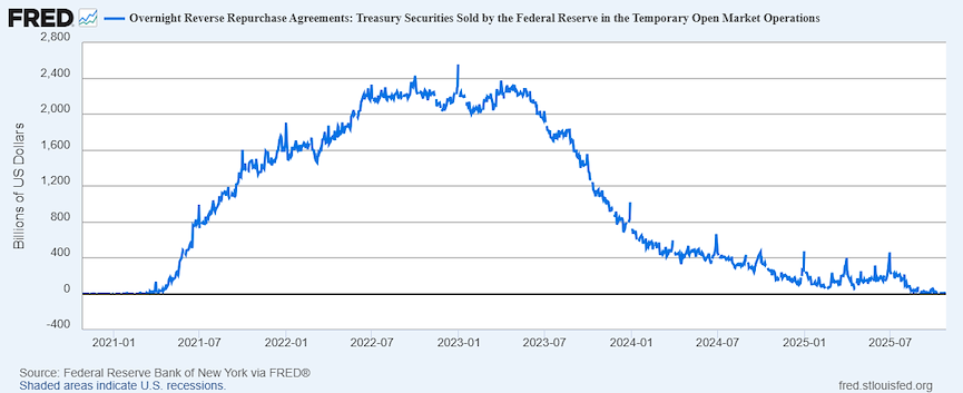 Face à cela, l’offre de financement repo, c’est-à-dire les prêteurs de cash, est moins extensible qu’il n’y paraît. Les fonds monétaires ont longtemps alimenté le système en recyclant leurs liquidités, mais leur principal réservoir excédentaire, les placements dans la facilité de reverse repo (RRP) de la Fed, s’est quasiment vidé.