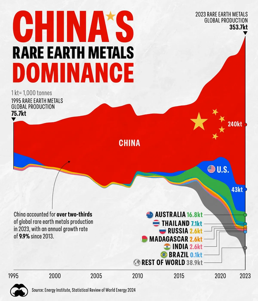 Cette extraterritorialité donne à la Chine un pouvoir inédit sur les chaînes d’approvisionnement mondiales. Pékin détient environ 60 à 70 % de la production mondiale de terres rares, mais surtout près de 90 % des capacités de raffinage, une étape indispensable pour produire les aimants permanents utilisés dans les véhicules électriques, les éoliennes et les systèmes de défense.