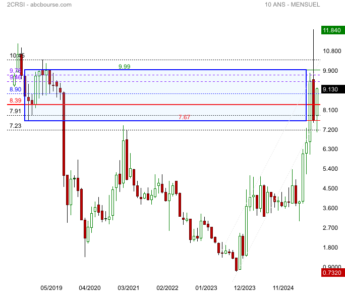 Nous sommes en zone de neutralité (7.67-9.99) avec 2 points importants (8.39-8.90) , en clôturant cette semaine >8.90 a 9.13 on peut viser 9.46- 9.76 qui sont résistances mais aussi des points pivots Kagi Mensuel -Trimestriel voir 9.99 haut du range