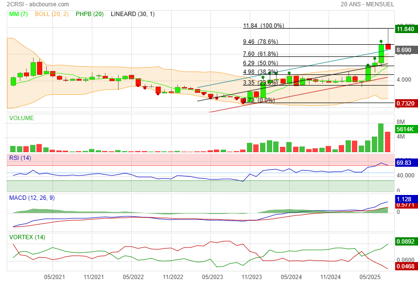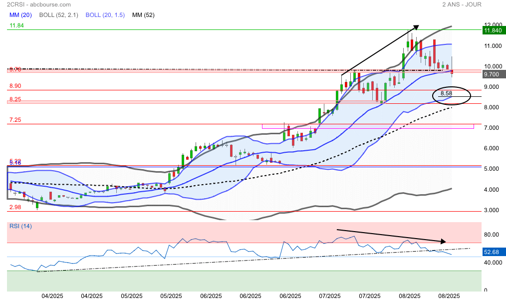 si 8,90€ cède, (ça y ressemble en ce moment), rendez vous autour de 8,20€ qui correspond aussi à la partie basse des bandes de Bollinger.