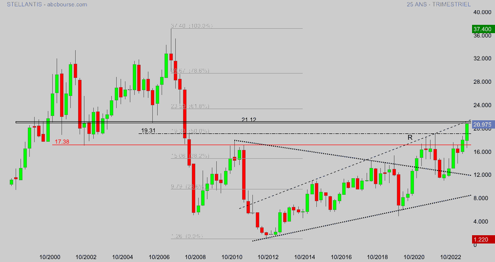 Comme indiqué dans les dernières analyses le franchissement de 19.31 et ratio finobacci 50% serait positif et nous arrivons déjà dans une zone de résistance horizontale 21.12 et l’oblique de progression R