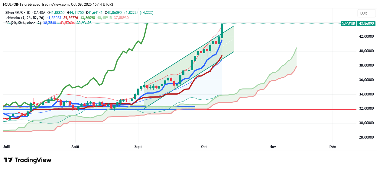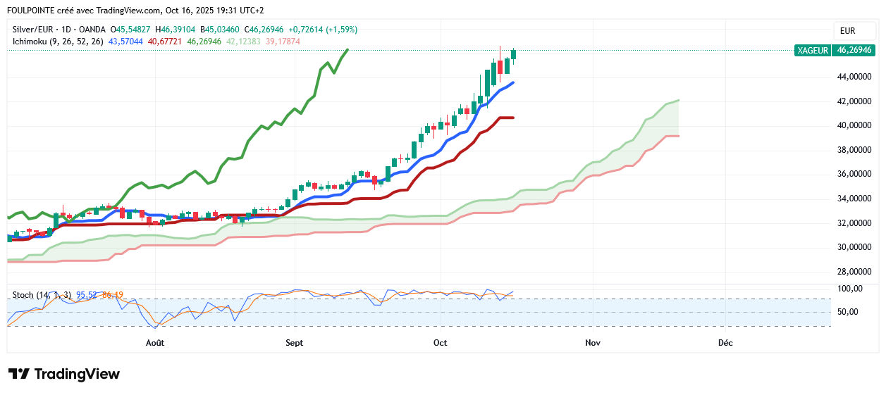 Les deux droites tenkan et kijun toujours en appui, elles collent à l'Argent. Le reste est au diapason.