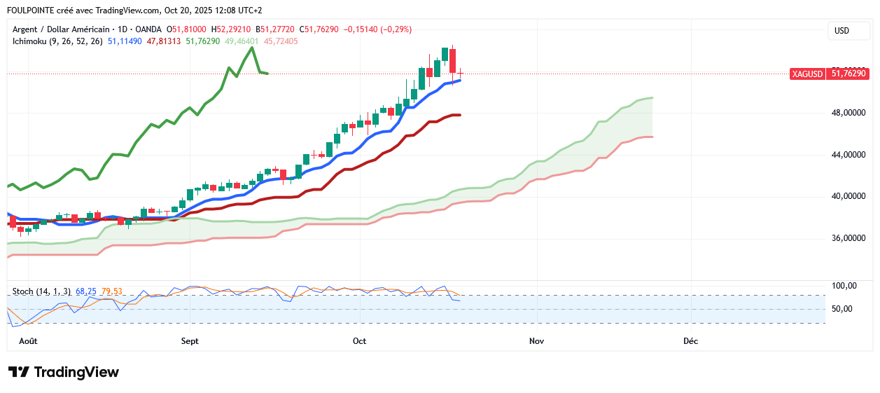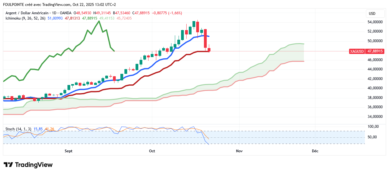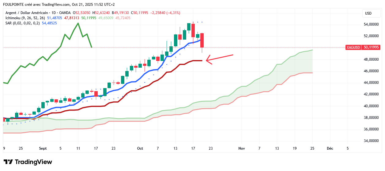 Après un plus haut sur les 54,24 $ et une baisse de 10 % l'Argent se stabilise sur les 49,29 $ juste la kijun actuellement sur les 47,84 $.