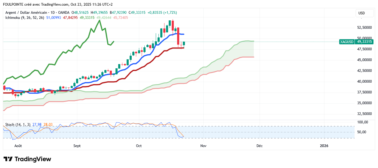49,07 $ et 50,01 $ ( extension de plat de kijun et kijun ), deux résistances à franchir pour l'Argent.