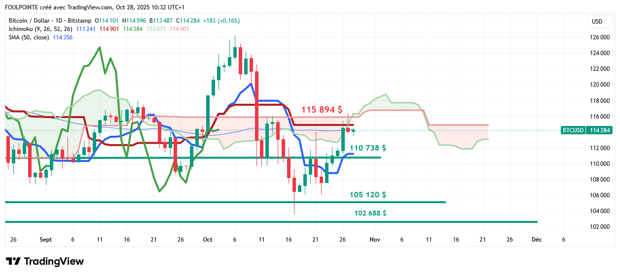 Et encore les baissiers ont beaucoup de chance car la kijun sur 114 901 $, véritable épine dorsale du graph évite aux cours de sombrer.