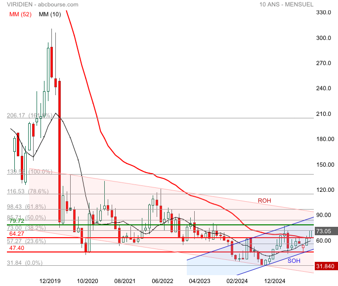 Le cours a franchi 64.27 pour tester 73€ 38% fibonnacci qui ouvrirait 79.70 et très certainement 50% de ratio a 85.70
