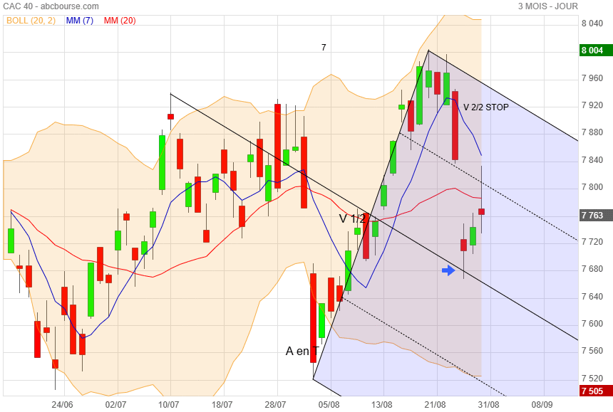 A Sortie BOLL, objectif MM20 vente moitié, objectif boll sup manqué, mais passage en short à la cassure de la MM7