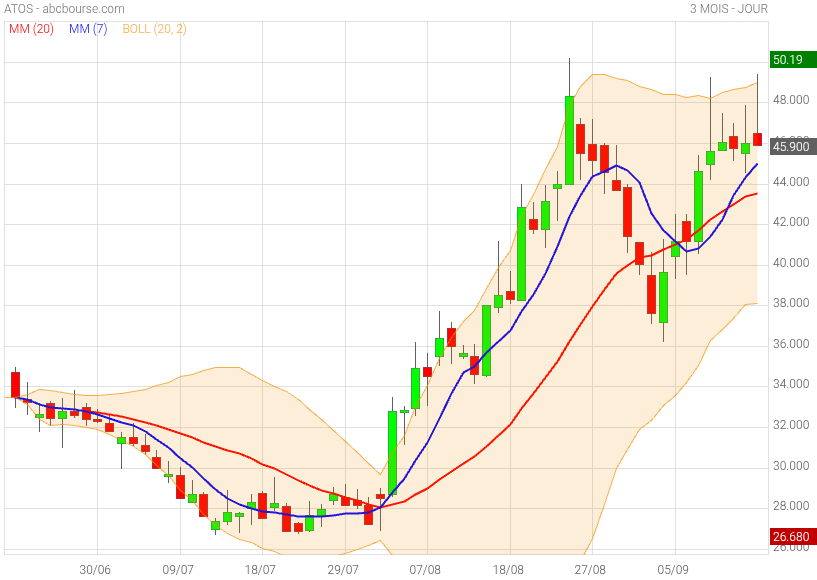 J'ajoute que graphiquement, en observant les indicateurs techniques pertinents, le cours a franchi le seuil de résistance fixé à 36,35 €, et les bandes de Bollinger au niveau supérieure, avant de revenir en dessous , cela suggère un potentiel ralentissement de cette dynamique haussière à court terme.