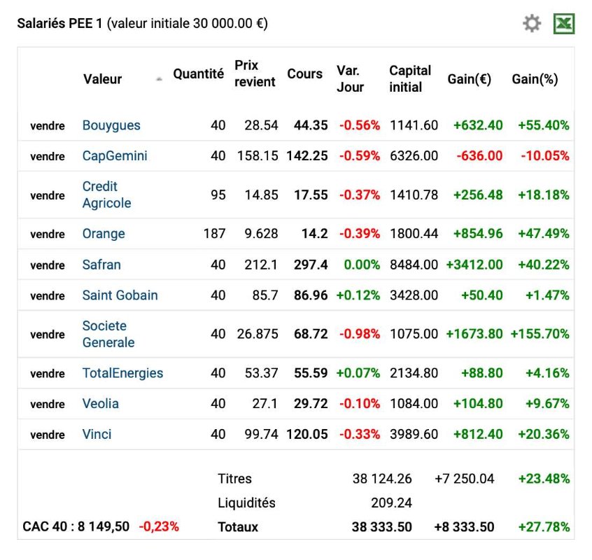 Je vous propose ici de suivre un portefeuille composé des 10 valeurs du CAC 40 ou l'actionnariat salarié est le mieux représenté.