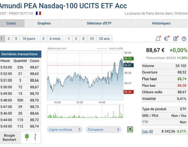 A la clôture vendredi 24 octobre 2025 le PEA NASDAQ-100 UCI la valeur était de 86,52€ et non pas 88,61€ comme indiqué à cet instant 15h58.