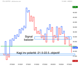 pas de grande baisse mais une dérive progressive, depuis (29.73-31.06),Cassure du dernier fibonnacci 26.18€ + ROB+GAP