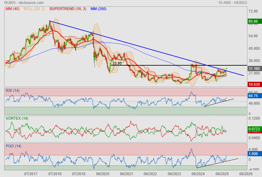 Résultat. Le résultat net de ce distributeur de carburant très présent en Afrique et dans les Caraïbes a augmenté en moyenne de 11% par an sur la période 2014-2024. L'activité est portée par l'évolution démographique, l'enrichissement de la classe moyenne et le développement du réseau routier dans les zones couvertes. Pour élargir son spectre vers les énergies vertes, Rubis a pris le contrôle de Photosol qui développe des parcs solaires... Alors que l'Ebitda était de 721 ME en 2024, il est annoncé entre 710 et 760 ME cette année. Le rendement atteint le niveau confortable de 6,8% compte tenu du dernier coupon de 2,02 Euros.