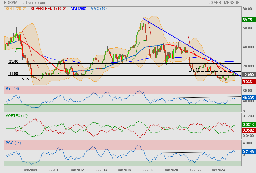 (Boursier.com) — Forvia bondit de près de 10% à 11,2 euros à l'ouverture du marché parisien, soutenu par un bon premier semestre et la confirmation de ses objectifs annuels. Le management a indiqué qu'il s'efforçait de réduire davantage ses coûts administratifs et industriels dans le cadre de son nouveau plan " Simplify ". Forvia, dont les ventes ont reculé de 0,4% au premier semestre à cause notamment des effets de change, a vu sa marge opérationnelle progresser de 20 points de base à 5,4% et son cash-flow net doubler à 418 millions d'euros. La firme a confirmé viser sur l'ensemble de 2025 un chiffre d'affaires compris entre 26,3 et 27,5 milliards d'euros, ainsi qu'une marge d'exploitation comprise entre 5,2% et 6% "en prenant en considération les droits de douane mis en place à ce jour".