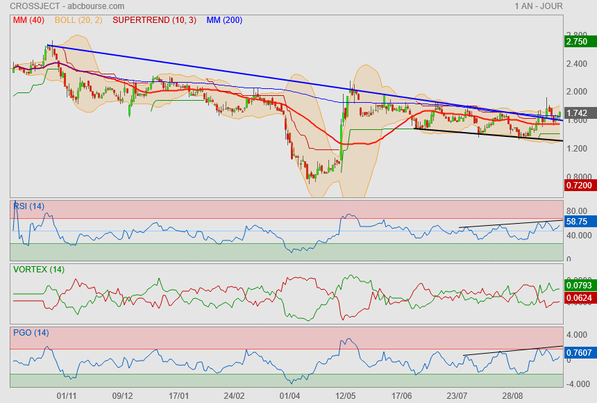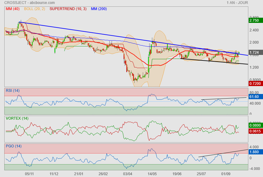 Sur le plan technique, l'action évolue désormais nettement au-dessus de ses moyennes mobiles à 50 et 200 jours, respectivement positionnées à 1,69 € et 1,66 €, ce qui confirme un momentum haussier à court et moyen terme. Cette configuration suggère que le titre a franchi ses principaux repères de tendance et que le mouvement de redressement observé depuis l'été se consolide progressivement. Les moyennes mobiles, encore très proches l'une de l'autre, témoignent d'une trajectoire qui restait hésitante sur le long terme, même si la dynamique récente s'est nettement améliorée.
