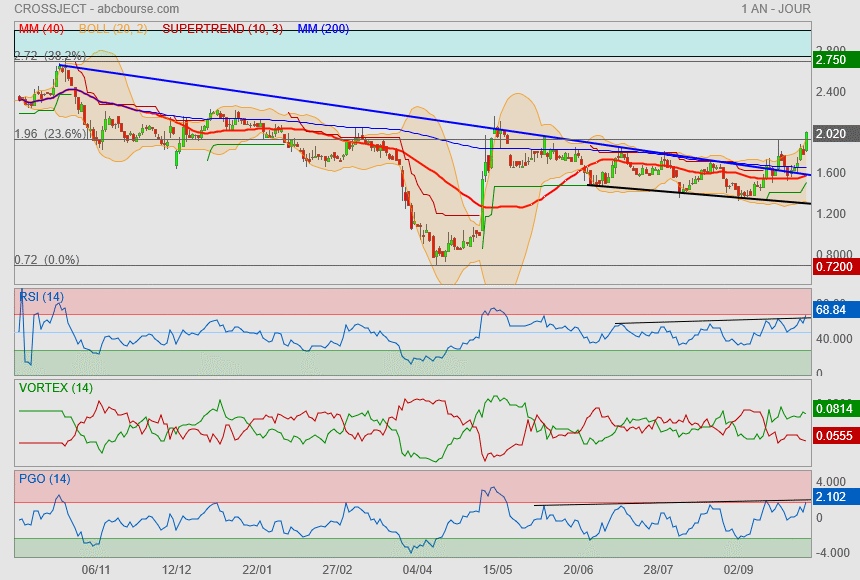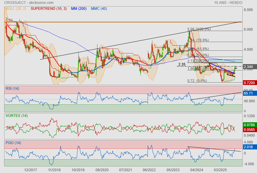 Les bandes de Bollinger, qui encadrent actuellement les cours entre 1,35 € et 2,49 €, se sont progressivement élargies au fil des séances, traduisant une augmentation de la volatilité accompagnant le mouvement haussier. Le cours actuel se situe dans la partie haute de cette enveloppe, proche de la borne supérieure à 2,49 €, ce qui peut indiquer une accélération récente des achats. Cet élargissement des bandes, après une phase de resserrement observée les semaines précédentes, est souvent interprété comme un signal d'intensification du mouvement en cours.
