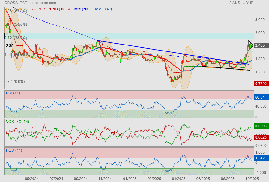 Cette remontée intervient alors que le cours s'est approché de son seuil de résistance technique situé à 2,48 €, niveau atteint en séance mercredi avant un léger repli les jours suivants. La volatilité du titre demeure élevée à 26,25 % sur un mois, reflétant l'ampleur des variations de cours récentes. Paradoxalement, le bêta de 0,29 indique une sensibilité historiquement faible aux mouvements du marché, ce qui suggère que les fluctuations actuelles sont davantage liées à des facteurs spécifiques à la société qu'à la conjoncture générale. Cette combinaison d'une forte volatilité et d'un bêta contenu caractérise souvent les titres de petites capitalisations cotés sur Euronext Growth, où Crossject est listé depuis 2014.ETF actifs