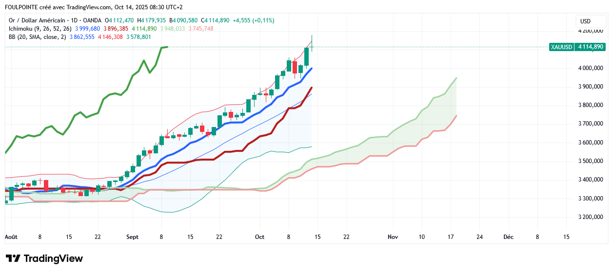 Prises de bénéfices sur l'Or en $ après un nouveau plus haut de tous les temps sur les 4 179,935 $. Normal, non ?