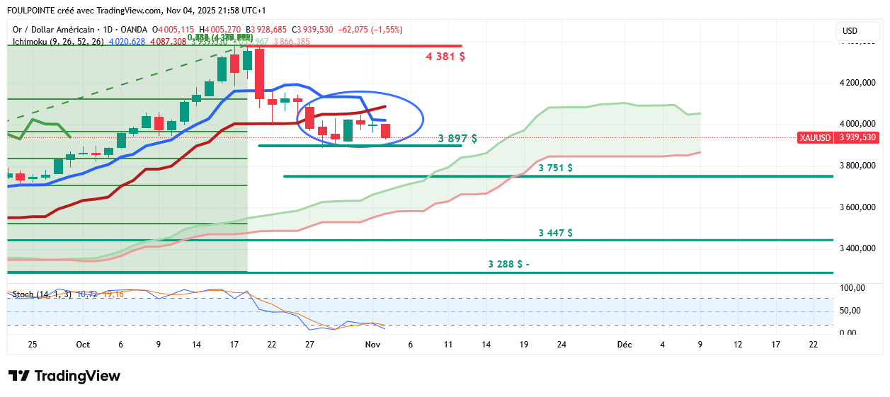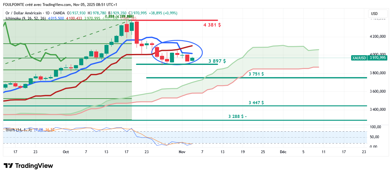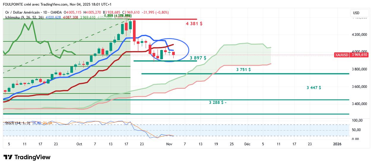 La main aux baissiers en ce qu'ils contiennent les cours sous les 4 000 $ et sous la tenkan actuellement sur les 4 015 $.