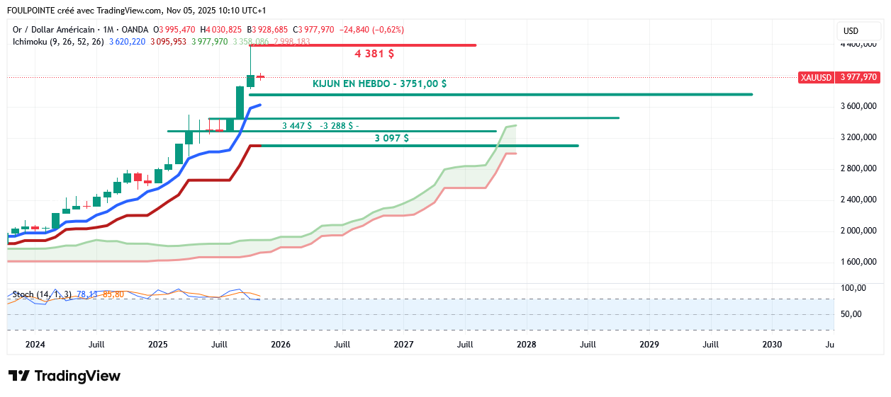 L'or semble se trouver dans une phase de consolidation saine après sa correction suite au record de 4 381 $ atteint le 20 octobre. Le repli des marchés actions mondiaux contribue à limiter les pertes du métal jaune, la baisse de l'appétit pour le risque offrant un certain soutien à son cours. Cependant, le potentiel de hausse reste limité en raison de la réduction des flux vers les valeurs refuges et de l'affaiblissement des espoirs d'une nouvelle baisse des taux d'intérêt de la Fed cette année.