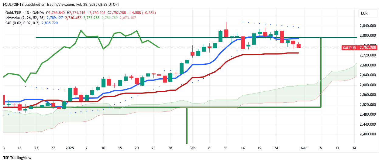 Graphiquement parlant, on navigue entre tenkan et kijun, l"Or en € tente de se stabiliser sur ses plus hauts.
