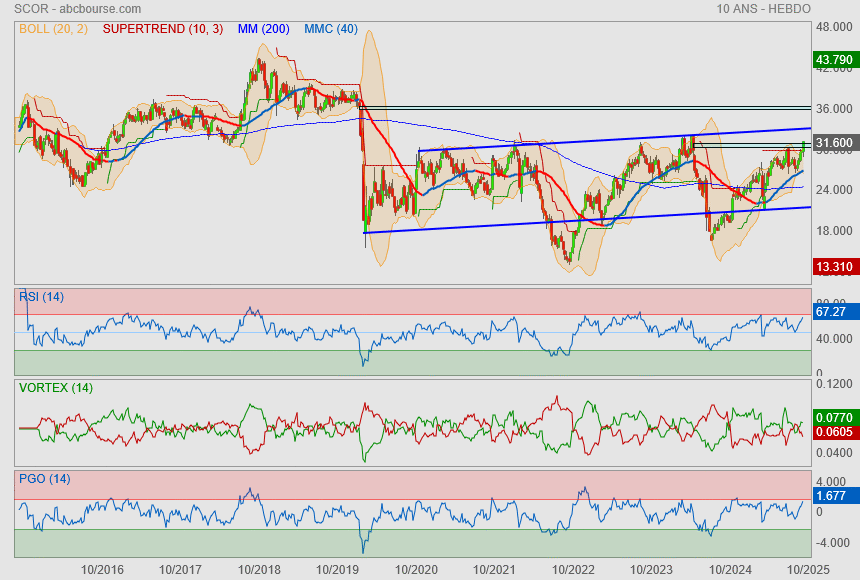 Lors des renouvellements de juin-juillet 2025, Scor avait poursuivi la croissance de ses lignes cibles et diversifiantes, tout en maintenant une politique de souscription disciplinée dans un environnement concurrentiel. À l'avenir, le groupe s'attend à ce que la surcapacité perdure dans le segment de la réassurance, ce qui devrait avoir un impact sur les prix. Scor reste toutefois déterminé à profiter des opportunités commerciales attrayantes, à maintenir une politique de souscription stricte, et est prêt à redéployer son capital ou réduire sa capacité si nécessaire pour atteindre son taux de rendement exigé... Le groupe publiera le 31 octobre prochain ses résultats du T3 2025.