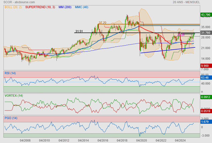 Rendement. Le rendement est également attractif. Alors que le coupon fixé au titre de l'exercice 2024 était de 1,8 Euro, la rémunération atteint 6,8%... Sur le fond, on constate aussi que Scor parvient désormais à limiter l'impact des catastrophes naturelles sur ses comptes. Par ailleurs, la composante spéculative n'a probablement pas disparu. On se souvient que l'assureur mutualiste Covea avait cherché à prendre le contrôle de la société en 2018 mais que le patron de l'époque Denis Kessler était parvenu à repousser l'assaillant. A l'époque, Covea était prêt à offrir 43 Euros par action Scor...