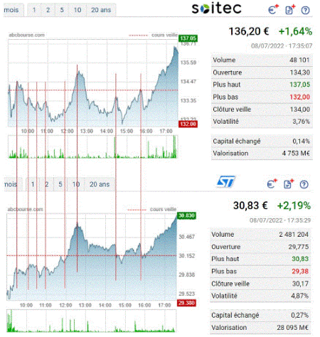 La concordance des variations entre STM et Soitec (voir le graphique de mise en parallèle des cours) me fait dire que les acteurs professionnels du marché voient les destins de ces deux entreprises comme liés.