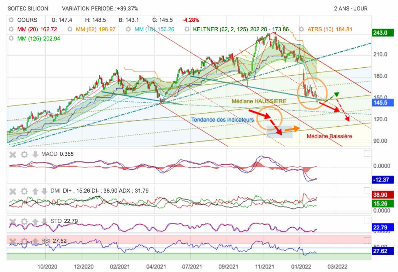 SOITEC : L'action a dévissé de plus de 18% vendredi dernier, puis de 8 % hier. Le groupe d'électronique, spécialiste des semi-conducteurs innovants, a pourtant tous les signaux au vert, mais les remous autour de sa nouvelle gouvernance inquiètent. La dynamique haussière depuis de nombreux mois est enrayée.