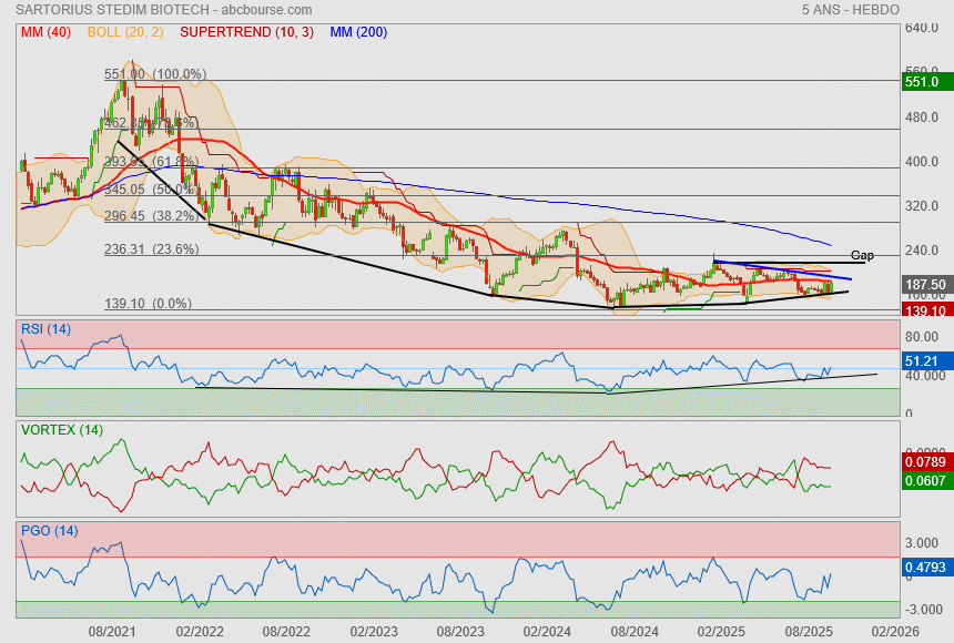 L’analyse de la valeur est baissière, la rupture du seuil 422-423€validait par report d’amplitude un objectif de 292-293€ atteint ou la valeur tente un rebond Mais en dessous de 342€ la pression baissière est forte .. la rupture de la zone rouge relancerait la baisse dont l’objectif serait 212€ extension du mouvement primaire ou le retracement de 61.8% du grand mouvement haussier ´ niveau où se situe la bollinger mensuelle à suivre…..