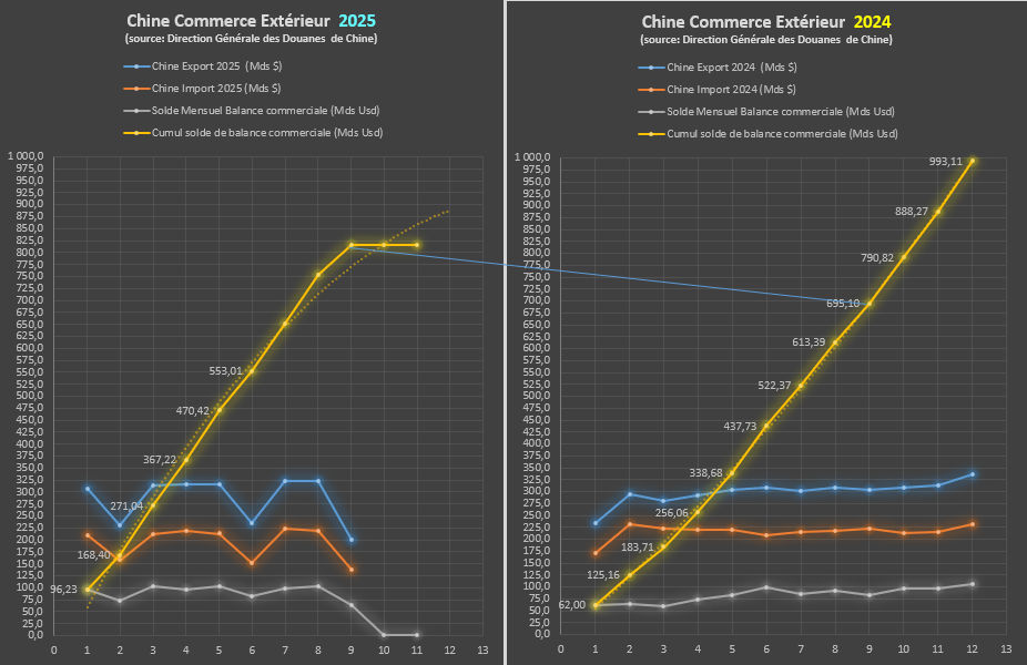 Comme dit déjà plusieurs fois, la baisse des exportations de la Chine vers les USA et l'UE est largement compensée par la hausse de ses exportations dans le reste du monde. Cette année, le montant total de l'excédent commercial de la Chine devrait compris entre 1100 mds $ et 1200mds$.