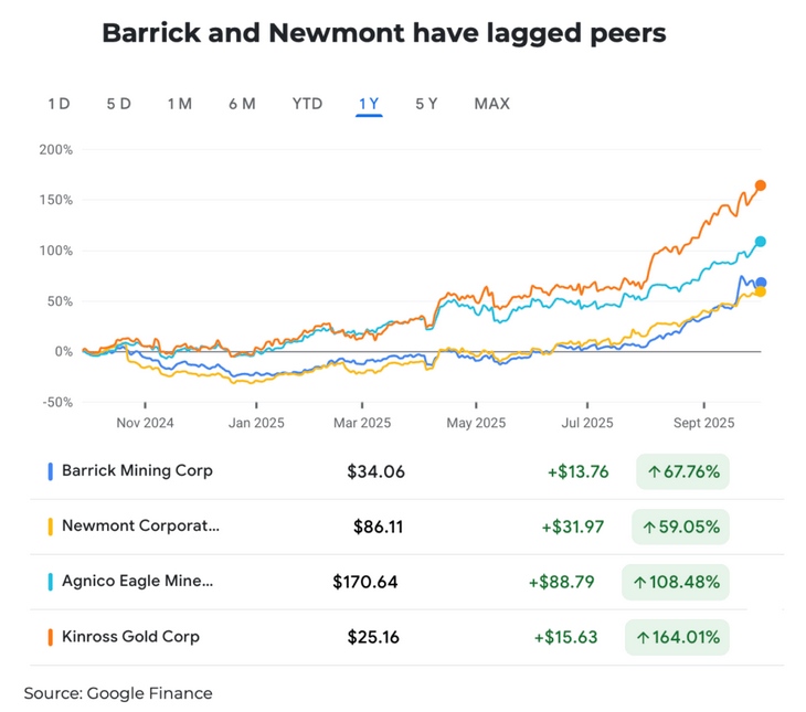 Pourtant, Barrick et Newmont sont à la traîne par rapport à leurs concurrents comme Agnico Eagle et Kinross, ce qui frustre les actionnaires avides de rendements plus élevés.