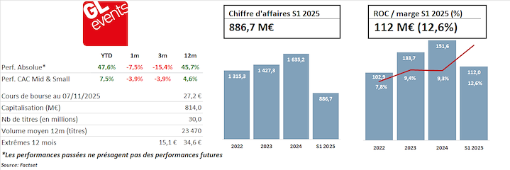 L’année 2025 est une année de transition pour le groupe après une très forte croissance réalisée en 2024, notamment grâce aux Jeux Olympiques. Cependant, en dépit de la publication d’un chiffre d’affaires du troisième trimestre en très net repli (-25%), souffrant d’une base de comparaison particulièrement défavorable en raison des JO, le groupe a confirmé ses guidances pour l’année 2025. GL Events ambitionne toujours de réaliser un chiffre d’affaires en croissance « au moins de +5% », d’améliorer sa marge opérationnelle courante et de réduire sa dette financière, hors impact des opérations de croissance externe.