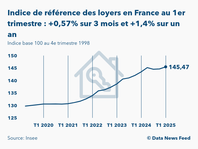 Au 1er trimestre 2025, l'indice de référence des loyers (IRL) s'est établi à 145,47 points, après 144,64 points au trimestre précédent, selon un communiqué de l'Institut national de la statistique et des études économiques (Insee) publié le 15 avril à 8h45. Ainsi, cet indicateur d'indexation des loyers grimpe de 0,57% sur trois mois et progresse de 1,4% sur un an, après respectivement +0,09% et +1,82% au 4e trimestre 2024.
