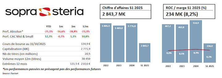 Les publications récentes montrent une certaine résilience du chiffre d’affaires et une capacité à générer du free cash-flow dans un environnement économique exigeant grâce au recentrage du périmètre et à la discipline opérationnelle. Après trois trimestres de croissance négatives, le cycle semble montrer des signes d’amélioration : plusieurs acteurs du secteur rapportent une amélioration du sentiment chez leurs clients (banques, assurances, administrations), potentiellement synonyme de commandes à venir.