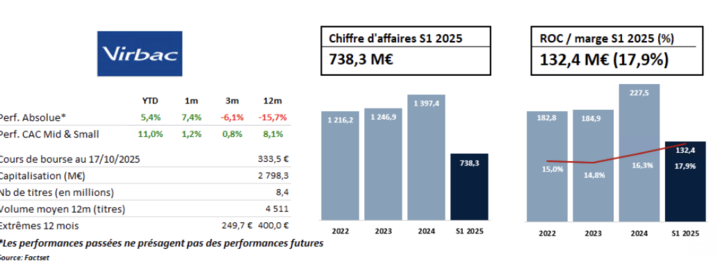 Grâce à un pipeline extrêmement prometteur pour les 5 années à venir et à un endettement maitrisé permettant de financer non seulement des opérations de croissance externe mais aussi des développements volontaristes en pet food, sur la Chine, ou encore dans les vaccins (un segment mieux margé et sur lequel le groupe s'est notamment renforcé avec les acquisitions de Sasaeah et Globion), Virbac est en bonne position pour poursuivre une croissance profitable qui devrait permettre au groupe d'atteindre d'ici 2030 l'objectif de 20% de marge Ebita.