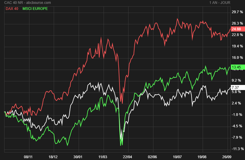 Pour comparer ce qui est comparable, voici ci-dessous le CAC 40 avec dividendes réinvestis en blanc, comparé au DAX allemand et à l'indice MSCI Europe sur un an. Paris est très en retard par rapport aux autres places. Alors certes le luxe, très présent dans le CAC a pesé, mais tout est quand même dans une ambiance un peu lourde.