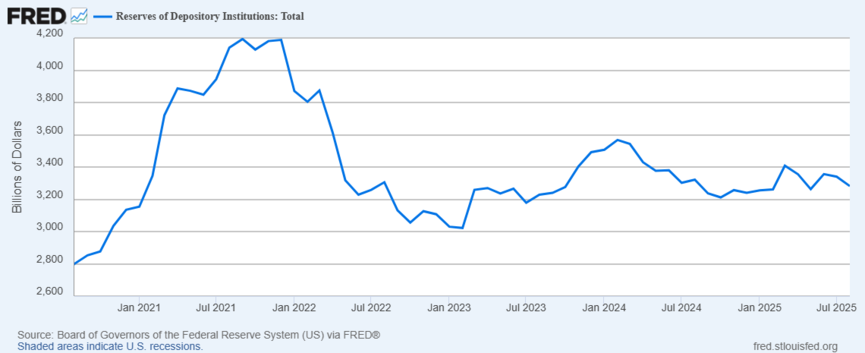 Les réserves bancaires constituent une forme de liquidité essentielle pour le bon fonctionnement des marchés monétaires. Lorsqu’elles diminuent, cela peut entraîner des tensions sur les taux interbancaires, rendre plus difficile le financement à court terme, et accroître la volatilité lors des adjudications de dette, surtout si les banques sont déjà proches de leurs limites réglementaires de bilan.