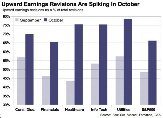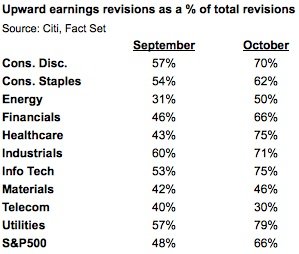 Par exemple, plus de 75% des révisions de bénéfices ont été positifs pour la Santé en octobre, comparativement à moins de 45% en Septembre selon ce tableau de la Citi :