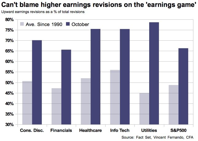 Comme indiqué ci-dessous, la tendance des révisions des bénéfices plus élevés est nettement supérieure à ce qui a été normale depuis 1990 :