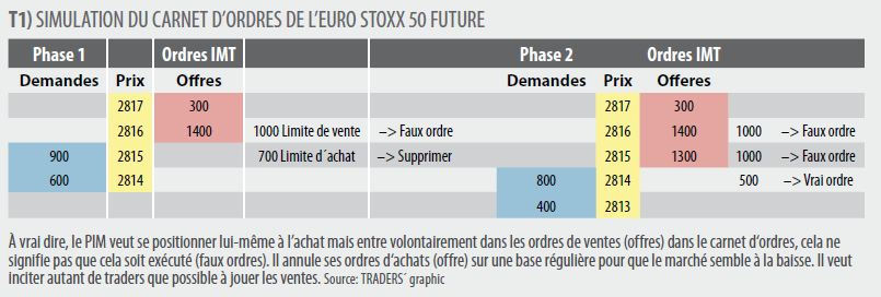 Considérons le premier tableau 1, phase 1, l’EURO STOXX 50 futures s’échange à 2815 (offre)/ 2816 (demande). Le professionnel institutionnel du marché (abréviation PIM) place 700 contrats à l’achat à 2815. Pour faire croire que le marché est à la baisse, il place aussi un ordre de vente de 1000 contrats à 2816, pensant que l’ordre ne sera pas exécuté puisque le marché est à la baisse.