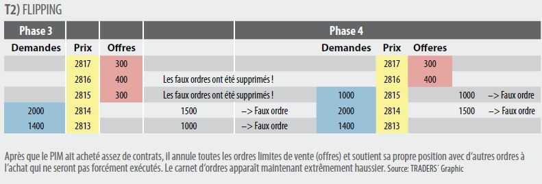 Une fois que le PIM a acquis le nombre de contrats désiré, il fait le "flip". Il offre 1500 contrats à l‘achat à 2814 et 1000 contrats à 2813 et en même temps, il annule ses ordres de vente à 2815 et 2816. Dans le Tableau 2, phase 3, vous pouvez voir comment le carnet d’ordres paraît soudainement.