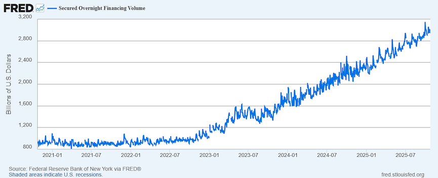 La demande de repo devient donc structurelle : tant que le déficit est élevé et que les Treasuries affluent sur le marché, le besoin de financement court terme collatéralisé augmente.