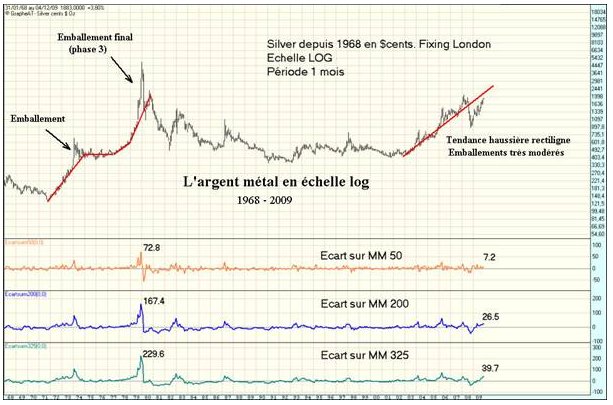 Pour terminer, j’aimerais vous présenter une vue du cours de l’or et de l’argent sur des graphiques de très long terme avec une échelle logarithmique. L’échelle logarithmique permet de mettre en évidence les accélérations malsaines sur le prix d’un actif, habituellement le signe d’un emballement final, causé par l’arrivée de la foule et des spéculateurs en herbe (voir Nasdaq fin des années 90). Tant que le prix reste sur une tendance rectiligne, les gains réalisés demeurent constants au fil des années, et il n’y a, à priori, pas (encore) de raison de suspecter la présence d’une bulle !