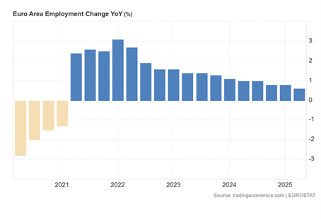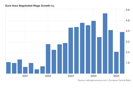 Le chômage a légèrement progressé, autour de 6,3 %, et les salaires négociés ralentissent nettement. Selon les données de la BCE, la croissance salariale passerait d’environ 3 % cette année à 2,4 % en 2026. Cette décélération, combinée à une productivité encore fragile, limite les risques de seconde vague inflationniste.