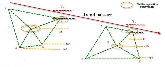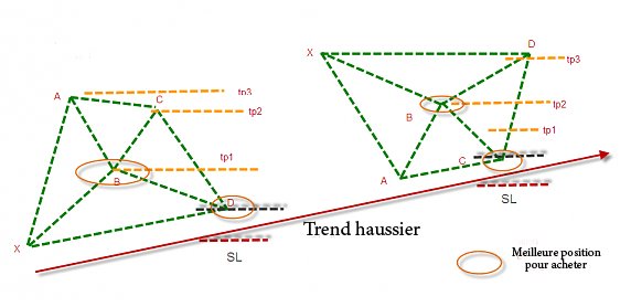 La zone délimitée par un cercle autour du point D ou C est une zone d’achat potentiel. Un Stop Loss (SL) est positionné en dessous du point X. L’avantage de cette technique c’est que la plupart du temps les Stop Loss ne sont pas très éloignés ce qui réduit énormément les pertes si la prévision ne se réalise pas.