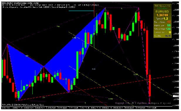 L’indicateur a repéré la forme automatiquement. Je me suis positionné un peu tard sur cette figure, l’ayant découverte par hasard en vérifiant des graphiques. Vous pouvez voir la ligne en pointillée verte pour la position en vente et celle en pointillée rouge passant au-dessus du point D (le plus haut) pour le Stop Loss.
