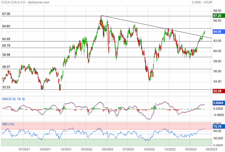 Dans l'hypothèse que les publications trimestrielles de KO répondent aux attentes du consensus, nous pourrions considérer que les bonnes nouvelles soient déjà intégrées dans les cours. Ainsi, le dicto " Acheter la rumeur et vendre la nouvelle " se solderait par des prises de bénéfices légitimes. Le titre refluerait en direction des 62$ pour attirer de nouveaux bulls et sans remettre en cause la tendance de bond. Ce qui favoriserait dans un futur proche, un throwback sur ce support en vue d'extension au-delà des 64$. Auquel cas, les 67$ seraient à portée de tir.